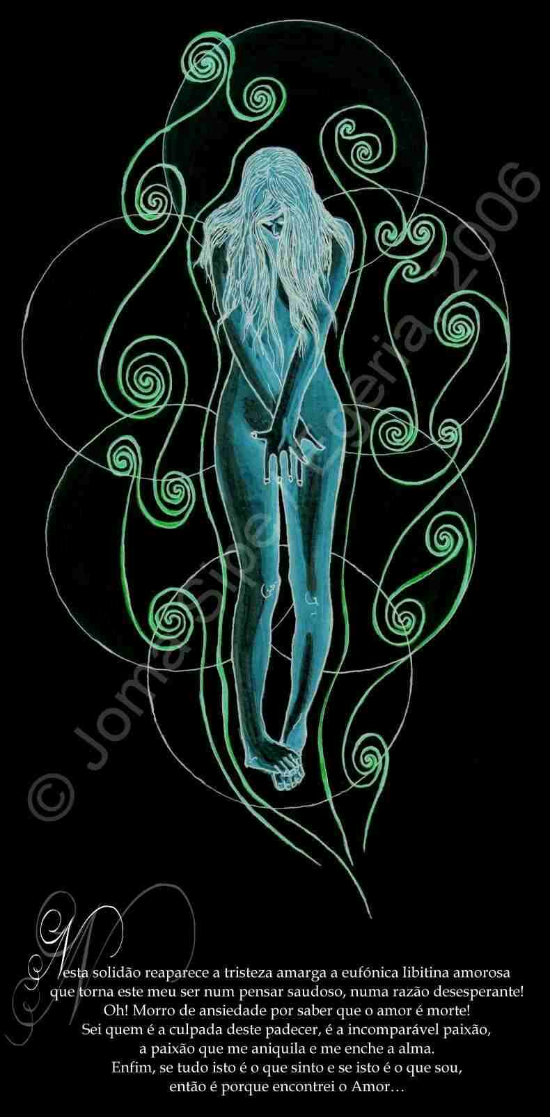 Nesta solidão reaparece a tristeza amarga a eufónica libitina amorosa que torna este meu ser num pensar saudoso, numa razão desesperante! Oh! Morro de ansiedade por saber que o amor é morte! Sei quem é a culpada deste padecer, é a incomparável paixão, a paixão que me aniquila e me enche a alma. Enfim, se tudo isto é o que sinto e se isto é o que sou, então é porque encontrei o Amor… |